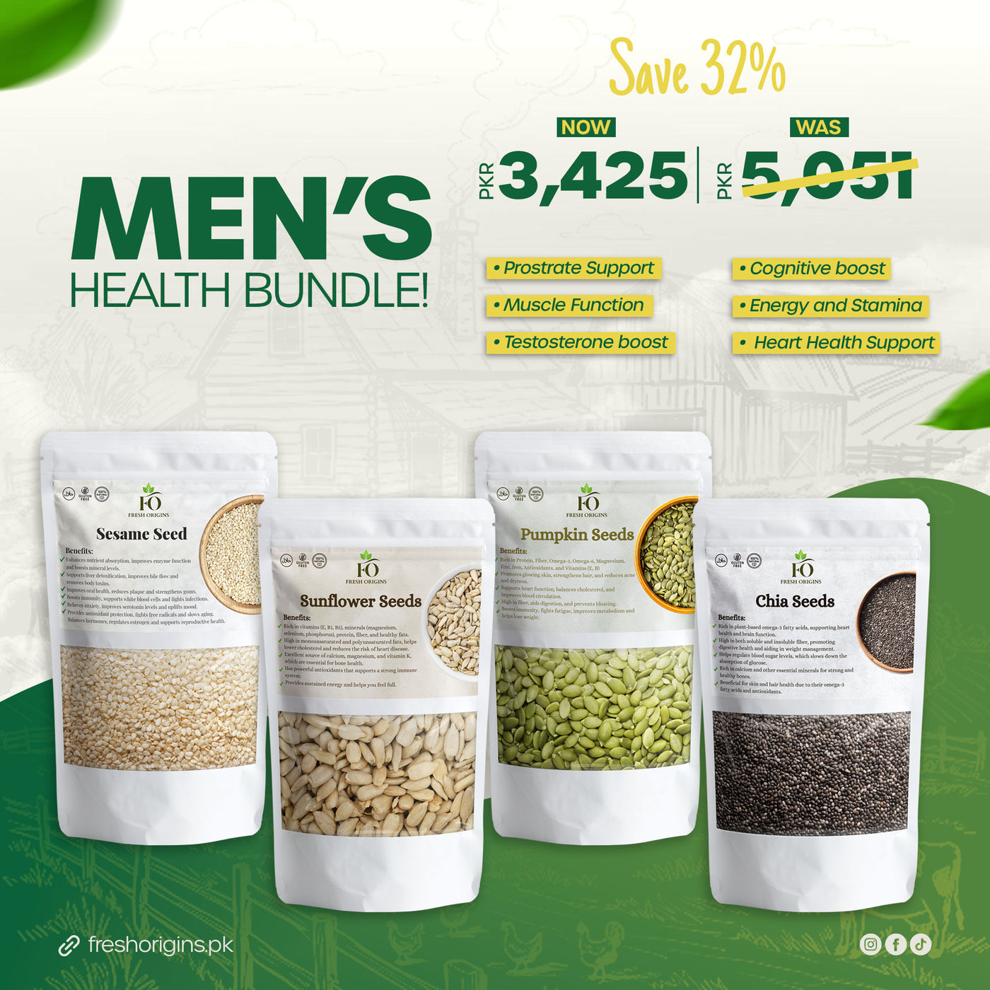 Fuel your vitality with our Men’s Health Bundle—a thoughtfully crafted mix of powerhouse seeds designed to support men’s wellness at every stage. This nutrient-rich 4-seed combo includes 100g each of Pumpkin, Sunflower, Sesame, and Chia Seeds—nature’s finest picks for strength, stamina, and clarity.